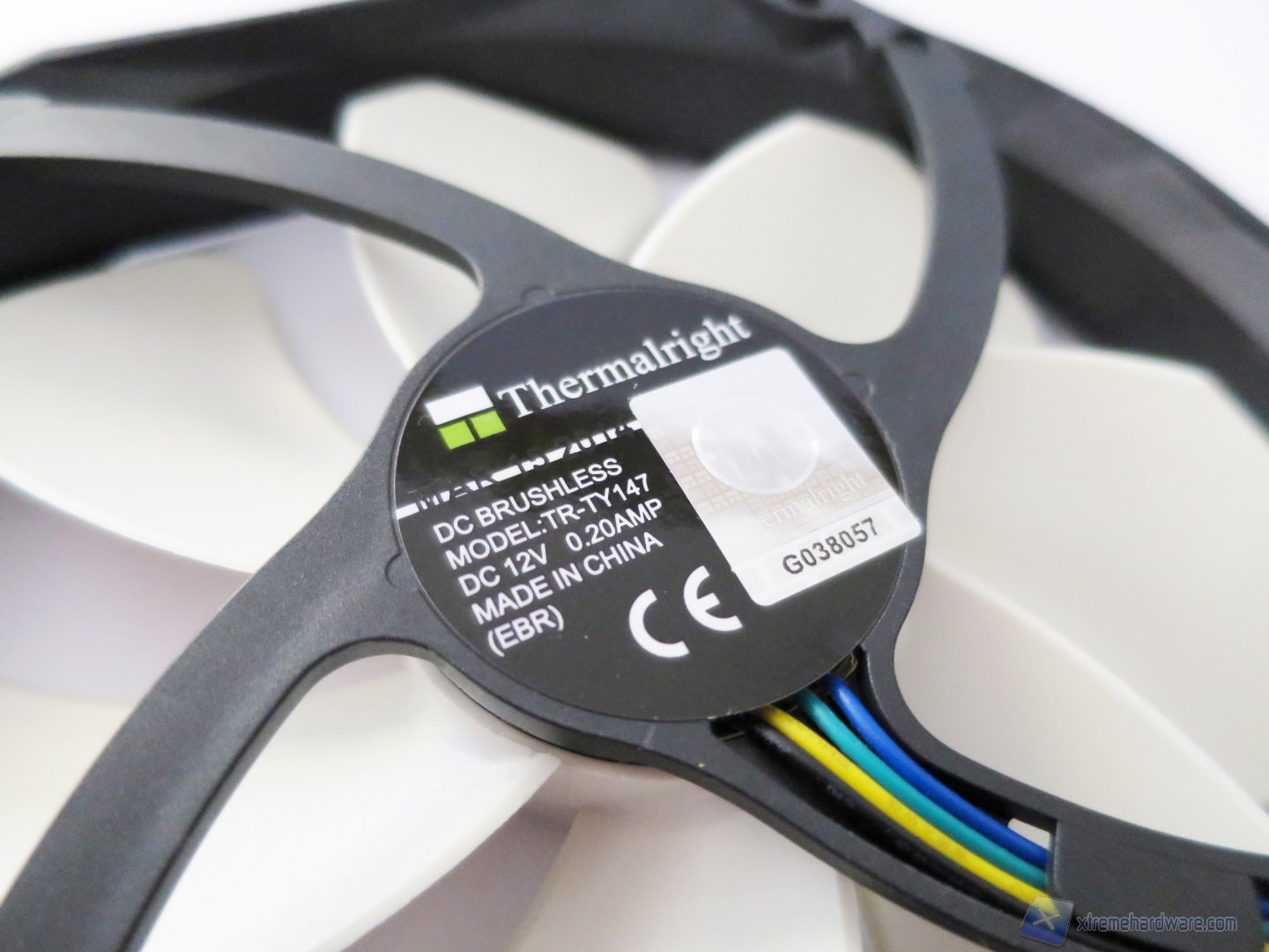 Detto questo passiamo all’analisi del modello Thermalight TR-TY147. La ventola ha dimensioni di 140 millimetri con uno spessore classico di 25 millimetri. La colorazione è nera per il frame e bianca per le 7 pale Silent Torpedo che la compongono. Le pale così come il frame non hanno la classica forma netta ma hanno un design aerodinamico il quale riduce la frizione consentendo un flusso uniforme e stabile. La ventola è dotata della tecnologia EHFB (Enhanced Hyper-Flow Bearing) che assicura RPM stabili e una vita prolungata della ventola stessa. La TR-TY147 ha un peso di 160 grammi ed assicura, essendo PWM, una rotazione compresa tra i 900 ed i 1300rpm garantendo dunque prestazioni più che valida ad una rumorosità contenuta. Infatti i valori dichiarati sono 17 – 21 dBA. La pressione statica della ventola è dichiarata inoltre per 28.3 - 73.6 CFM, un valore molto buono viste le dimensioni della ventola. La ventola come sempre è dotata di un cavo rivestito in treccia di tessuto (colorazione nera) ed un connettore a 4 Pin PWM in grado di adeguare la velocità alla temperatura della CPU.