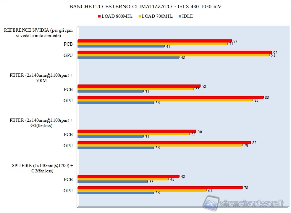 4. Sul dissipatore reference invece la velocità di rotazione è stata settata su auto, quindi questo è lo scenario reale che molti di voi avranno avuto modo di verificare direttamente. Le impostazioni sono quelle proprie dei modelli reference Nvidia e la velocità di rotazione a frequenze stock (700MHz) è stata di 1616 e 4075 RPM rispettivamente in idle e full load, mentre in overclock a 800MHz sono pari a 1617 e 4600RPM, raggiungendo il 90% del massimo regime di rotazione del dissipatore Nvidia reference. Non sono stati utilizzati profili personalizzati ed il voltaggio della scheda video è stato fissato a 1.050V. In idle la scheda imposta valori estremamente bassi ovvero 50MHz per il core, per via dei sistemi di risparmio energetico onboard, quindi le temperature in idle sono praticamente identiche sia a default che in overclock. Per questo motivo abbiamo inserito solo un valore inerente alle temperature in idle.