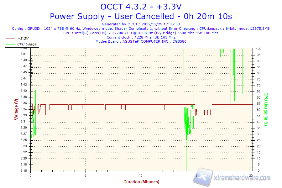 Possiamo subito osservare che la lettura della tensione +12V non sia corretta, in quanto il software rileva un valore poco inferiore ai 7V. Prendendo per buone le letture effettuate dal tool sul 3.3 e 5V possiamo notare continui spike di tensione nell’ordine delle decine di mV; tuttavia, è possibile apprezzare un importante calo di tensione superati i 15 minuti di test.