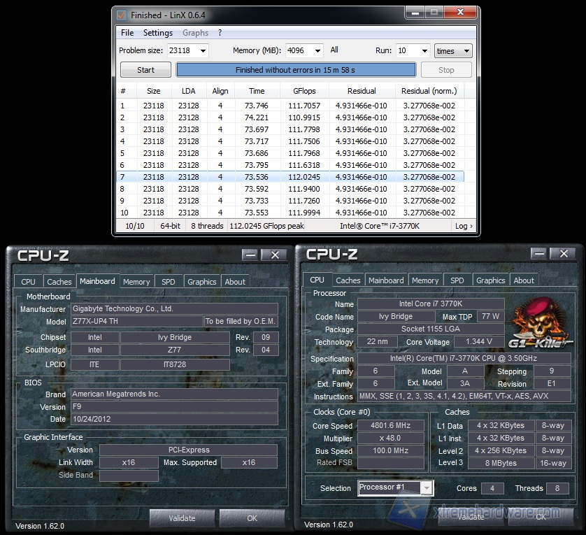Siamo riusciti a concludere i 10 cicli di test alla frequenza di ben 4800 MHz, che considerando che stiamo parlando di una CPU di classe Ivy Bridge, è ottima. Soffermatevi sul valore computazionale di picco, ben 112,02 GFlops, il valore di tutto rispetto secondo solo alla MSI Z77 Mpower e conseguenza dell’ottimo lavoro svolto sia da Intel sul processore Ivy Bridge che ne ha potenziato l’ALU, sia dell’ottima sezione di alimentazione della Z77X-UP4 TH basata su tecnologia Ultra Durable 5 con Driver Mosfet  ecomponentistica selezionata . Sempre raffreddando il processore a liquido abbiamo effettuato i test di overclock per ricercare il massimo valore di Bclk.