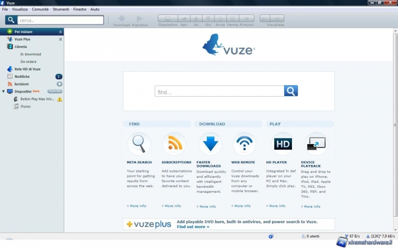 Vuze è un lettore multimediale per video digitali ad alta risoluzione che permette di individuare, scaricare e riprodurre video in HD su PC, Mac, iPhone, iPod, Xbox 360, PS3, PSP e TiVo.
